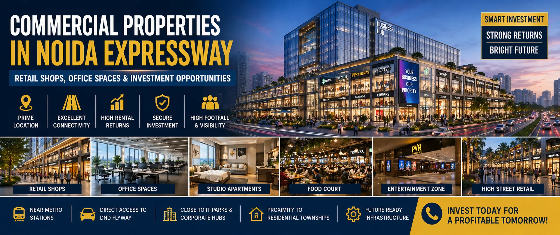 way are among the most attractive investment options in Delhi NCR due to their strategic location, modern infrastructure, and strong connectivity to major business hubs. The Noida Expressway corridor has rapidly transformed into a premium commercial destination offering high-street retail shops, corporate office spaces, serviced suites, studio apartments, and mixed-use developments designed for long-term business growth and rental income opportunities.Investors and business owners are increasingly choosing Noida Expressway commercial projects because of metro connectivity, proximity to IT parks, residential catchment areas, and upcoming infrastructure developments. Whether you are planning to open a business outlet or invest for rental returns, commercial properties on Noida Expressway provide strong appreciation potential.